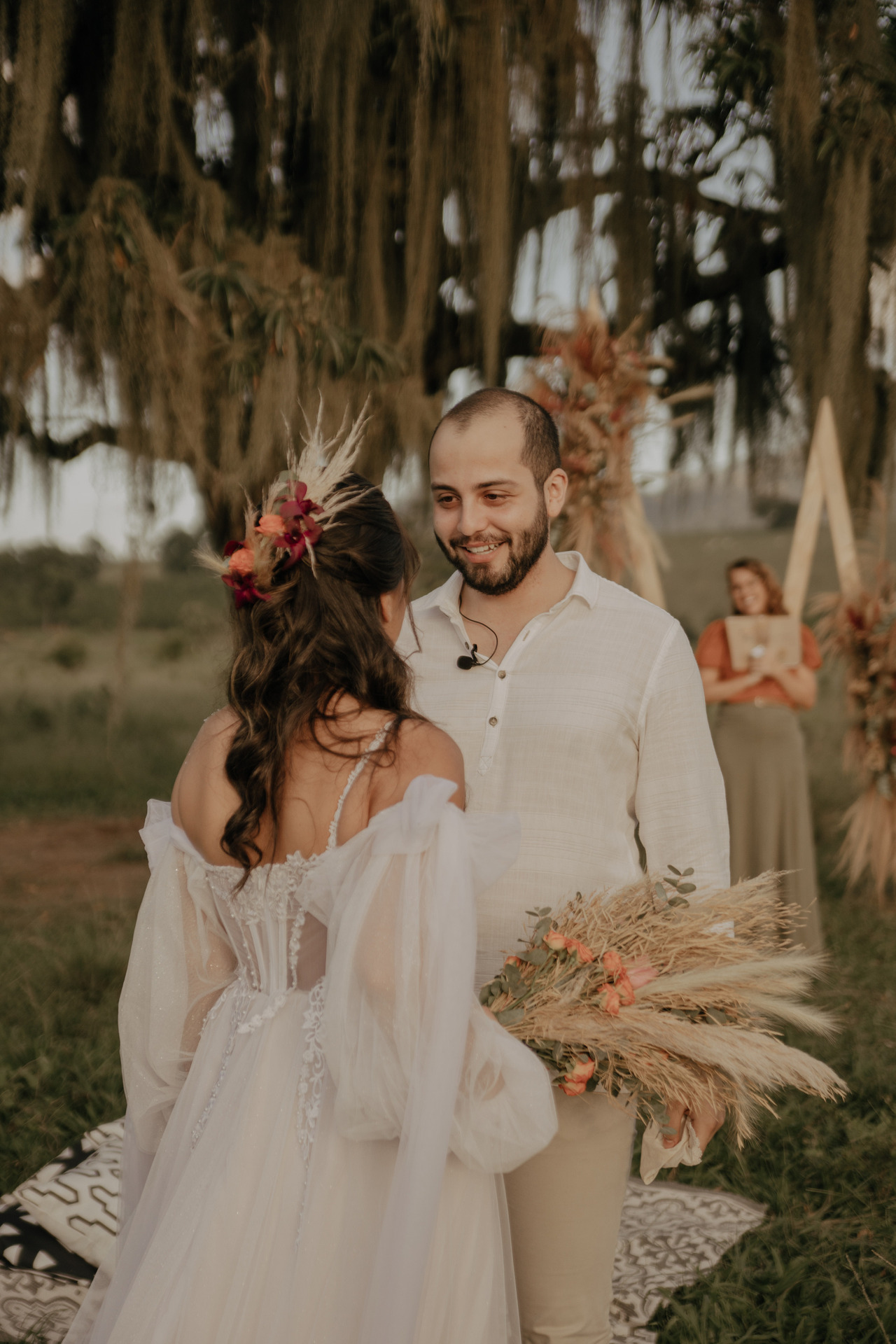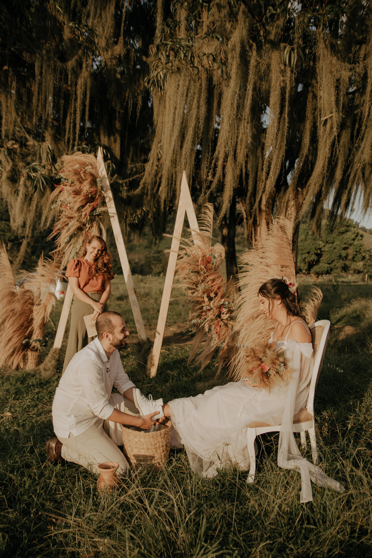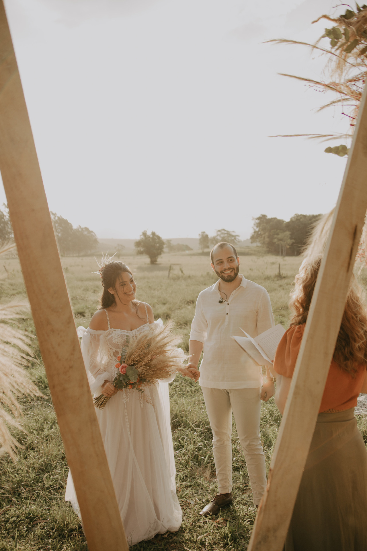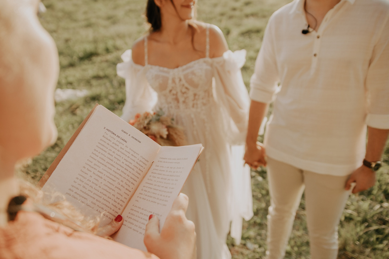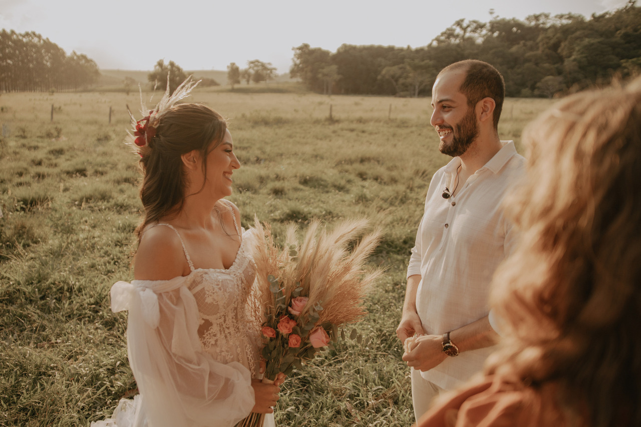 Tivemos uma linda decoração no estilo boho, uma celebrante, troca de votos, música com voz e violão e um momento emocionante que foi o "lava pés".