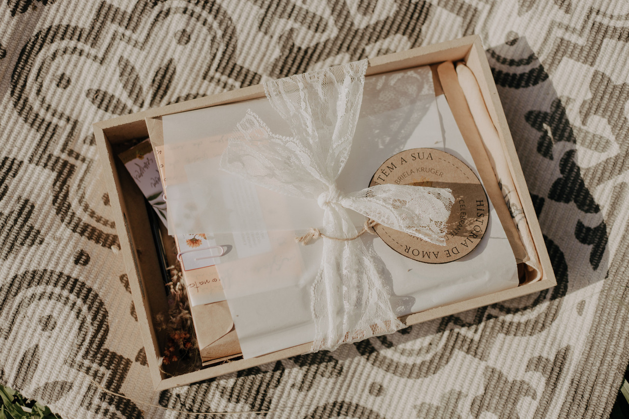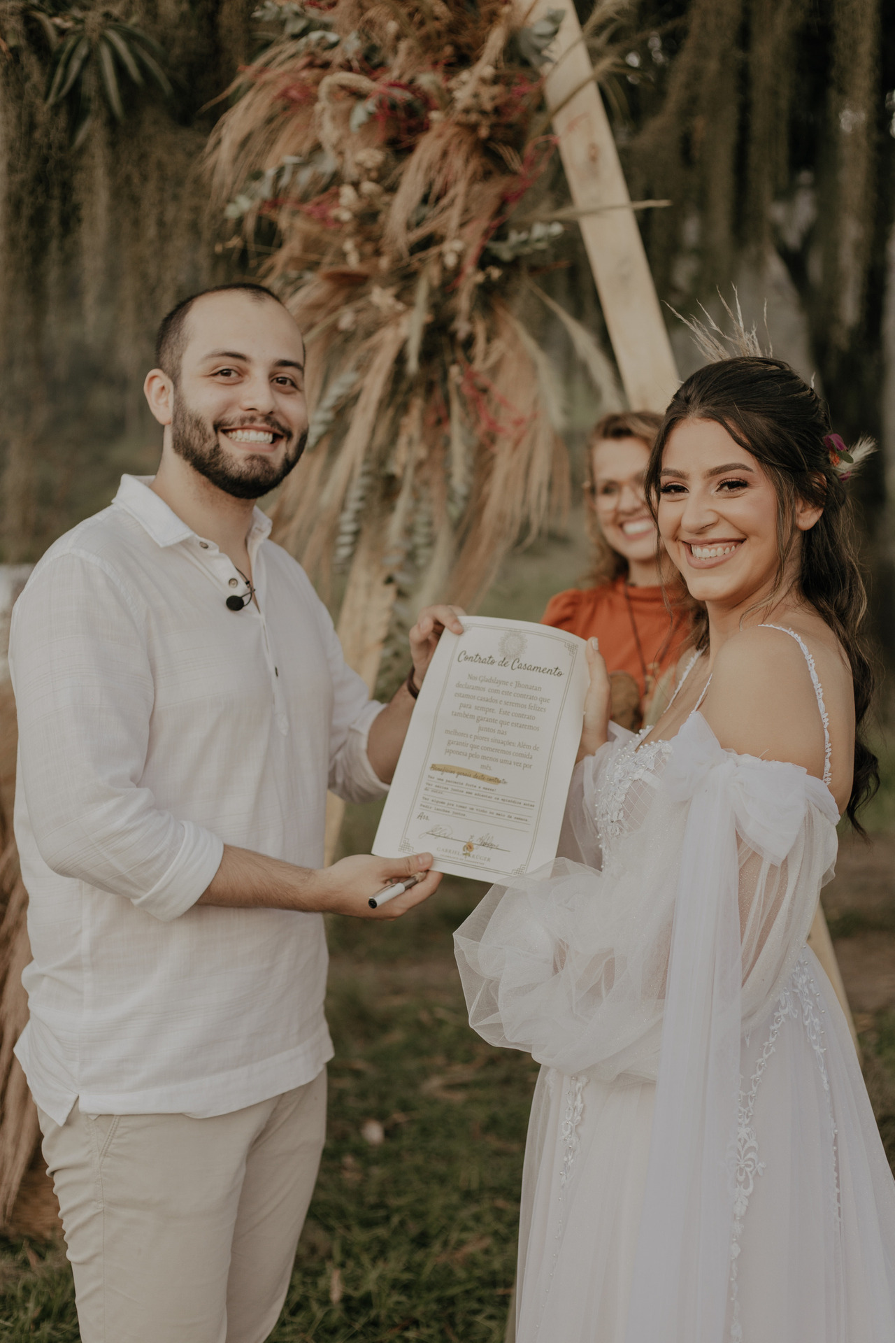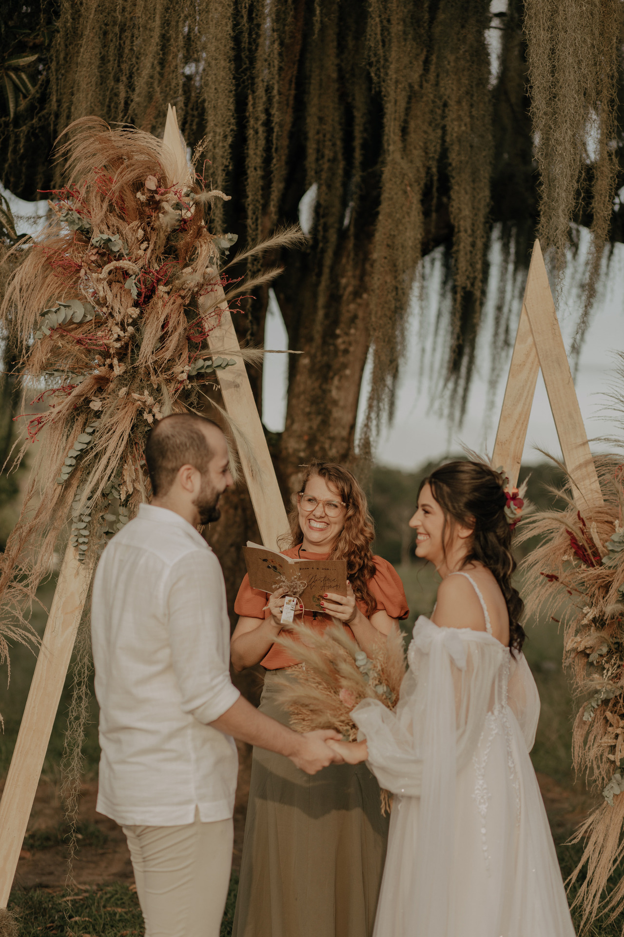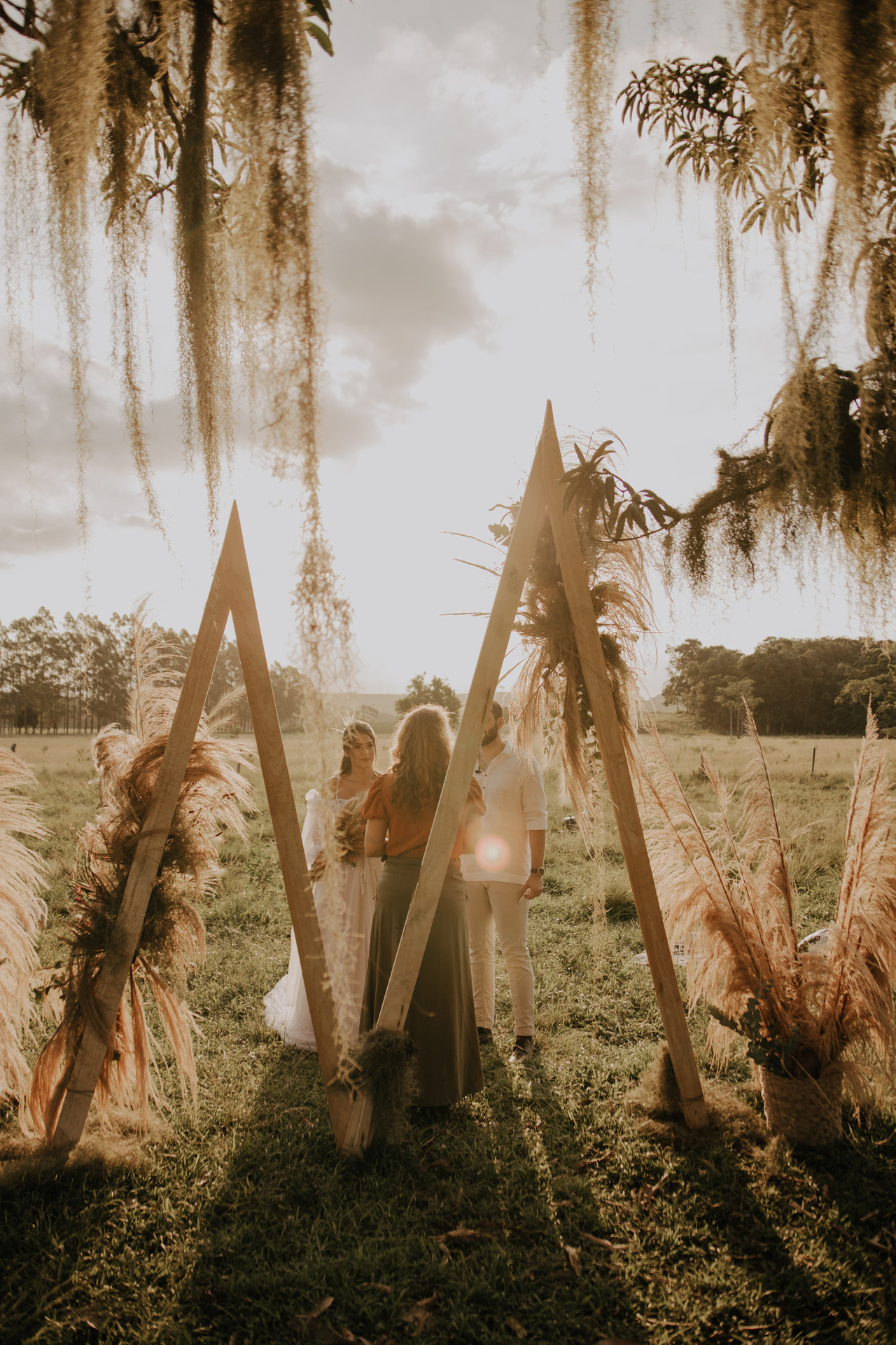 Tivemos uma linda decoração no estilo boho, uma celebrante, troca de votos, música com voz e violão e um momento emocionante que foi o "lava pés".