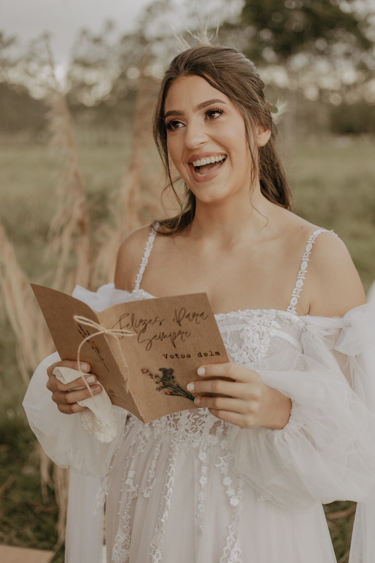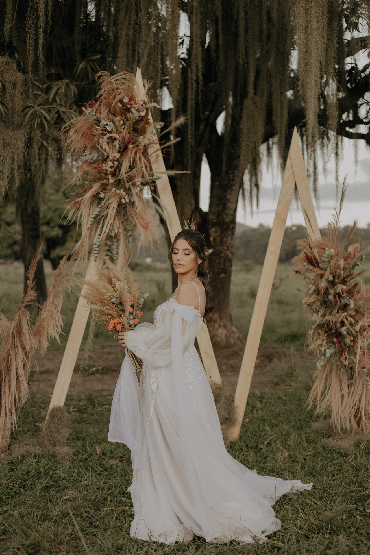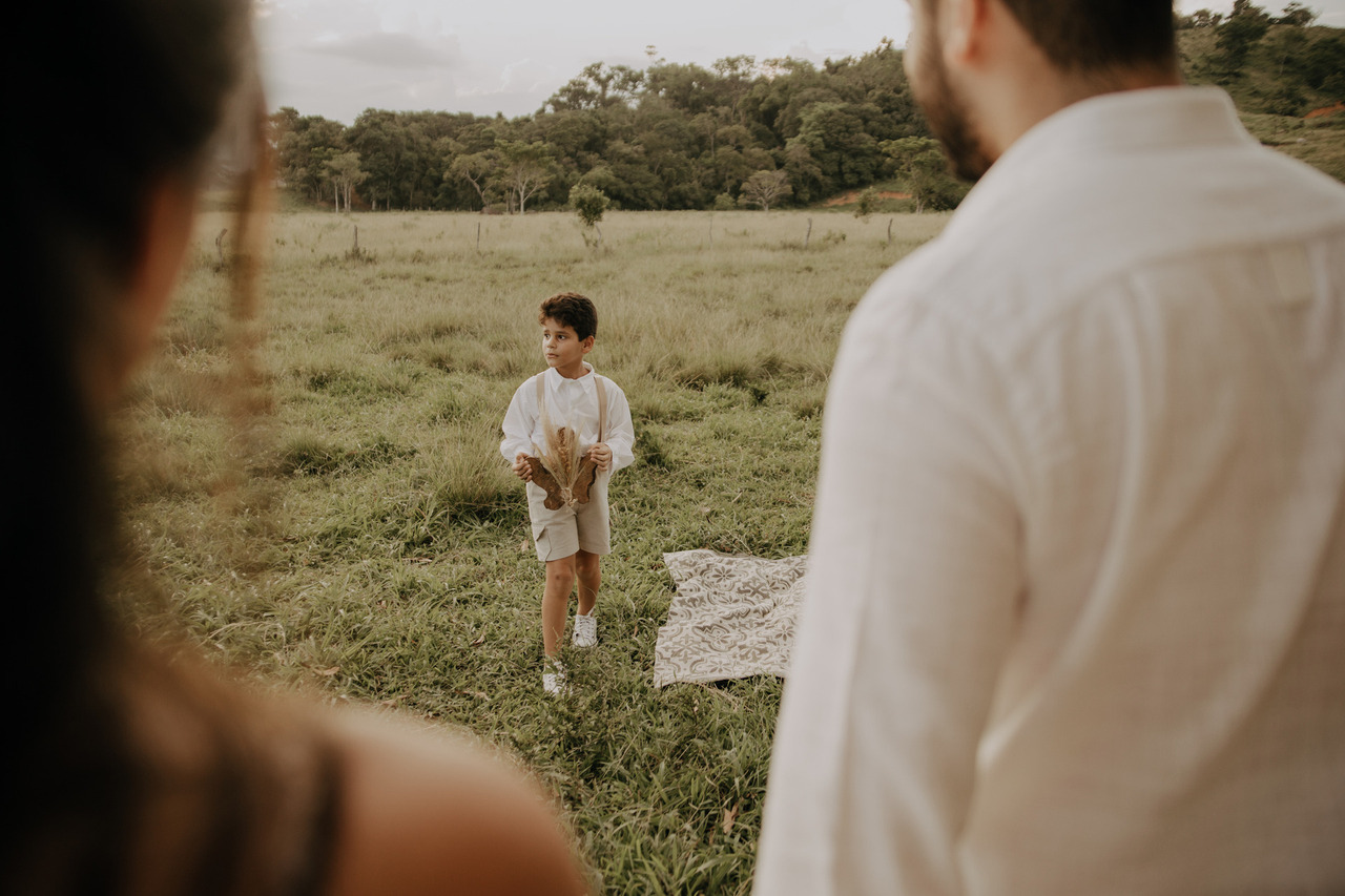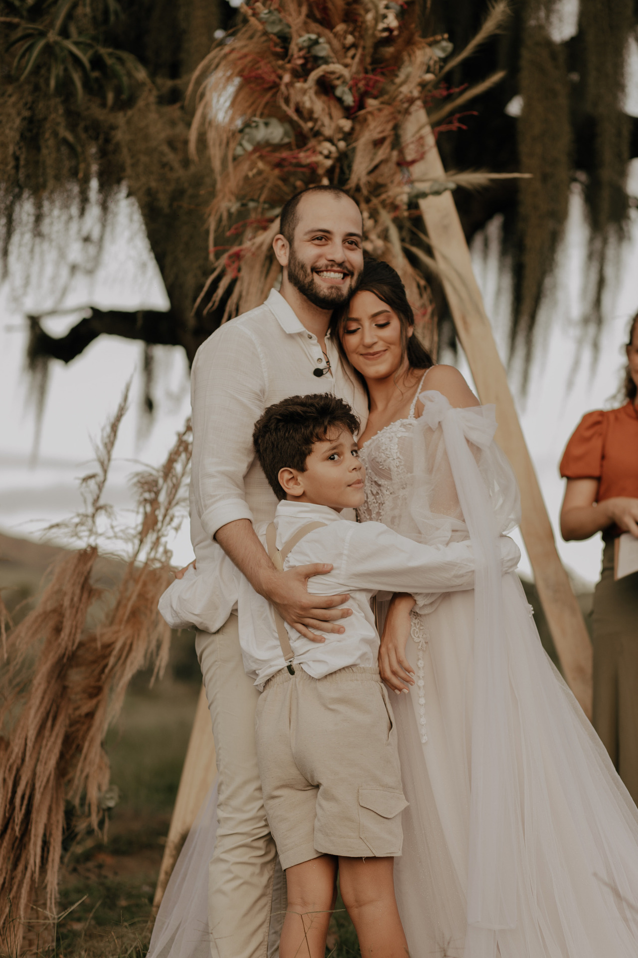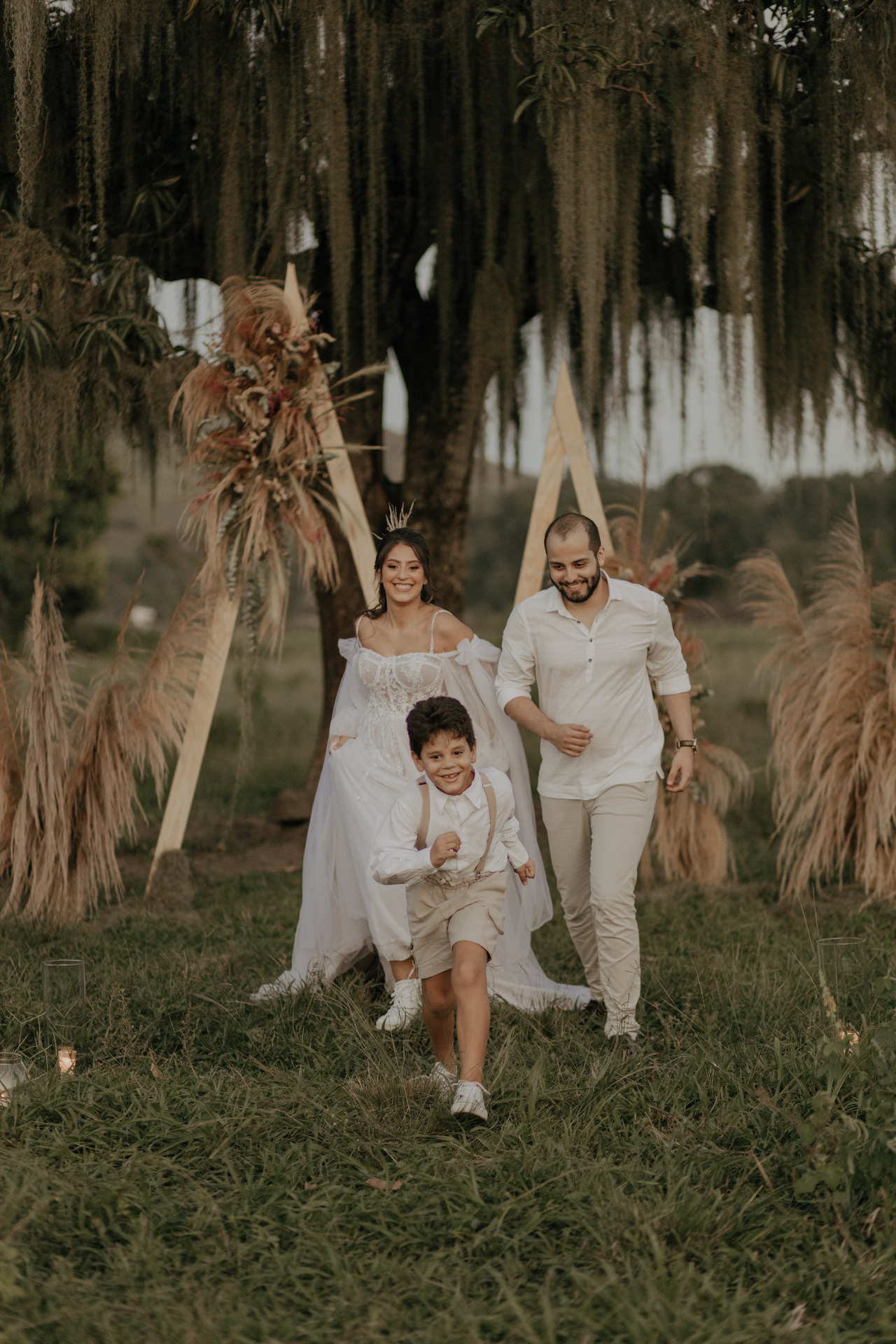 Tivemos uma linda decoração no estilo boho, uma celebrante, troca de votos, música com voz e violão e um momento emocionante que foi o "lava pés".